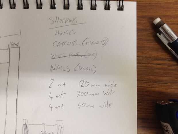Me puse a trabajar con papel y lápiz esbozar mis ideas ásperas. Mide la oscilación de la puerta y el espacio disponible así que tuve una guía aproximada para trabajar. Una vez tuve mi dimensiones y la idea aproximada de cómo quería añadir mi compartimiento secreto, puse yo una lista de compras y se puso a trabajar. En lugar de intentar hacer (como lo he hecho en el pasado) con piezas que tienen ahí, decidí comprar las piezas de anchura adecuada, me ahorro tiempo rasgar o cortar piezas a su tamaño. Una vez que tuve todos mis largos de madera, las bisagras y retenes magnéticos para el compartimiento secreto, puso a trabajar.