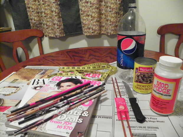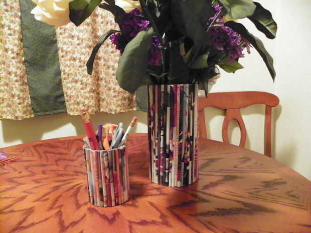 ¿qué hacer con todas esas revistas usadas? Bien, aquí es una divertida idea! Este es un proyecto rápido, sólo toma un par de horas para el portalápices y quizas 3 para el jarrón. Las fuentes se necesita para ambos son: 2 o 3 revistas viejas, (el florero necesita entre 50-60 páginas y las necesidades de soporte de lápiz alrededor de 20 páginas). Regla, tijeras, pegamento mod Podge o decopauge, soda de plástico de 2 litros de la botella, tamaño 7 7 tamaño de la aguja de tejer. vacío puede de maíz o de judías verdes, mina fue 4-1/2" alto y unos Q-tips para aplicar el pegamento.