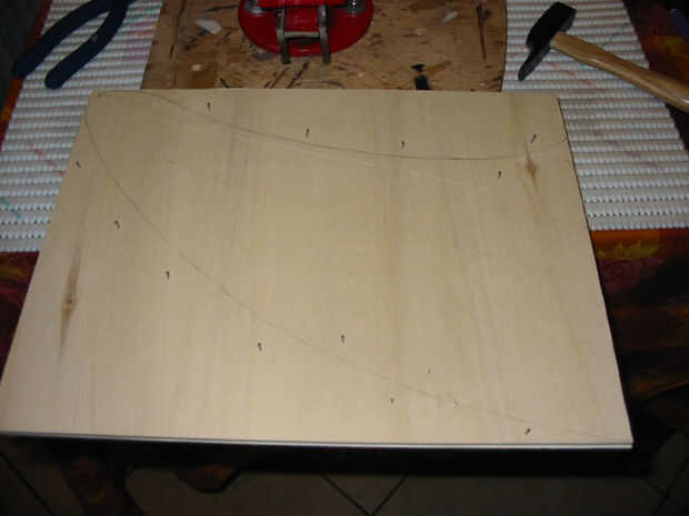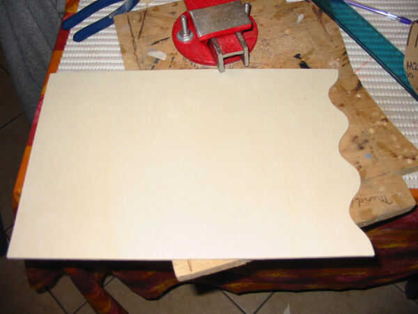 En la segunda fase el borde redondeado se cortan los tableros cuadrados previamente preparados para obtener la silueta final. Esto implica el borde superior de los cuatro paneles verticales (C, D, E y F) y el lado de los dos paneles (A y B), que son en forma de aleta. Nota que los dos lados de los paneles debe ser idéntica. Fácilmente obtaint dos piezas idénticas, usted puede unirse a ellos como un sándwich por unos pequeños clavos antes de cortar el borde redondeado. De esta manera puede cortarlos juntos y usted está seguro de obtener dos piezas perfectamente superpuestas.