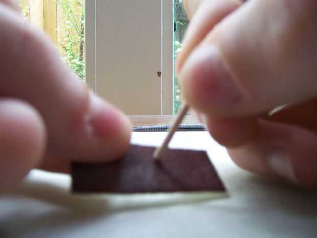 Mientras usted corta, debe lijar hacia abajo los extremos de cada palillo un poco. Esto ayudará a hacer los cortes de antes un poco de limpiador y será esencial si un palillo de dientes no encaja en la ranura.