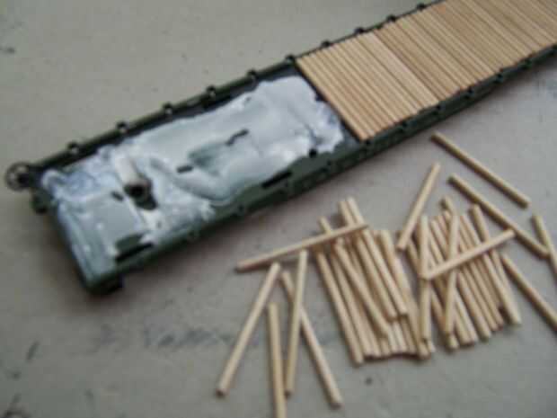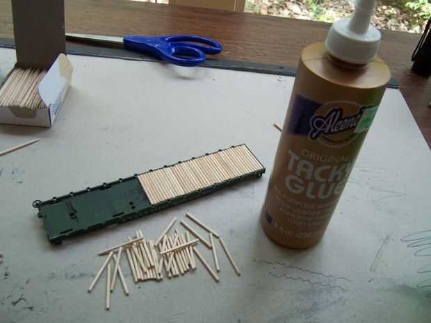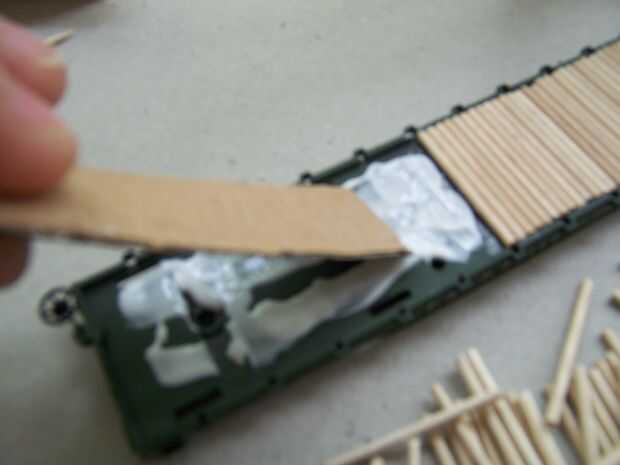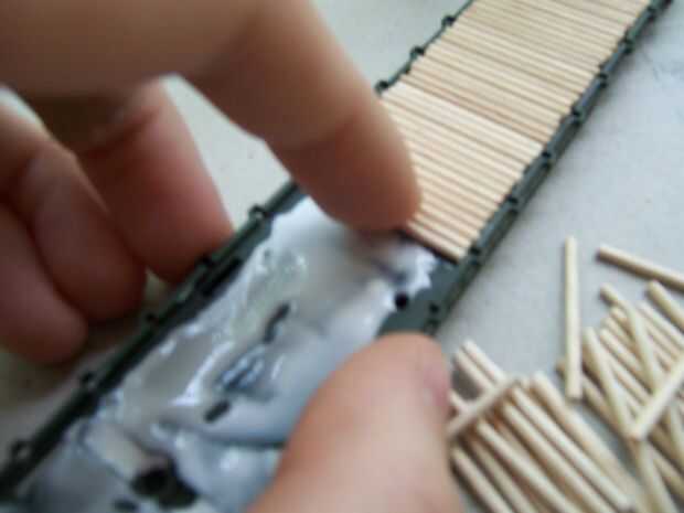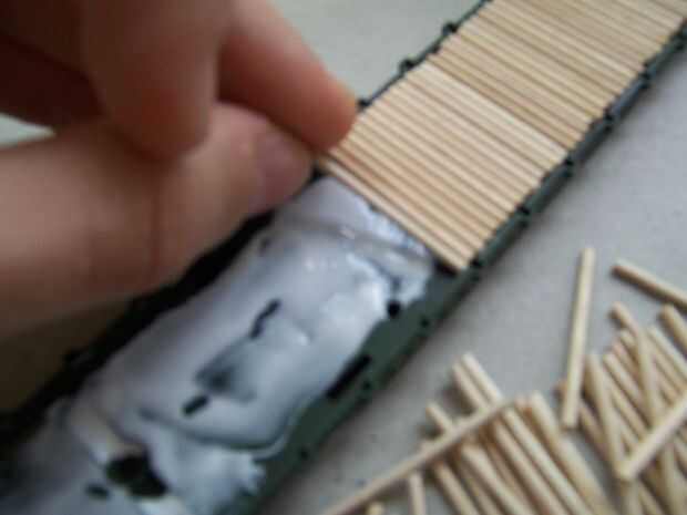 Ahora se pone el pegamento y 'ubicados', empezar a poner los escarbadientes en el espacio de la cubierta. Colocarlas en su posición y les empuje firmemente hacia arriba al lado de cada palillo de dientes anterior. Poner en posición y...