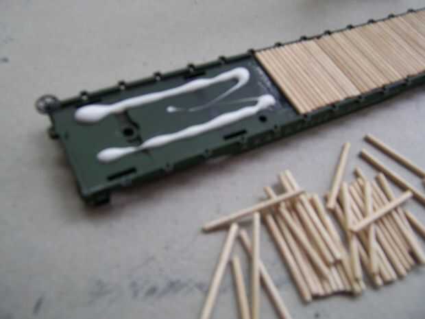 Puede ser tentador empezar a abofetear a sus "tablas", pero si lo haces ahora terminará con globos indecoroso de pegamento rezuma hacia arriba a través de la plataforma. Puede secar claro, pero todavía no es bonito. Utilice la tira de cartón para extender el pegamento, cuidando de obtener toda la longitud del coche y no hacerlo sobre los lados. Esto hará que el pegamento ir más lejos y evitará filtración excesiva.