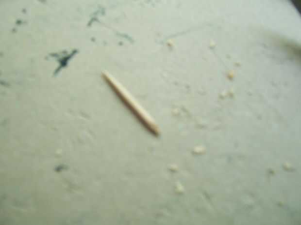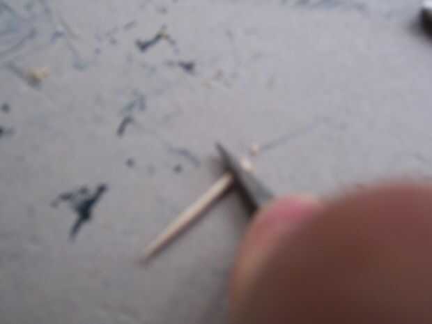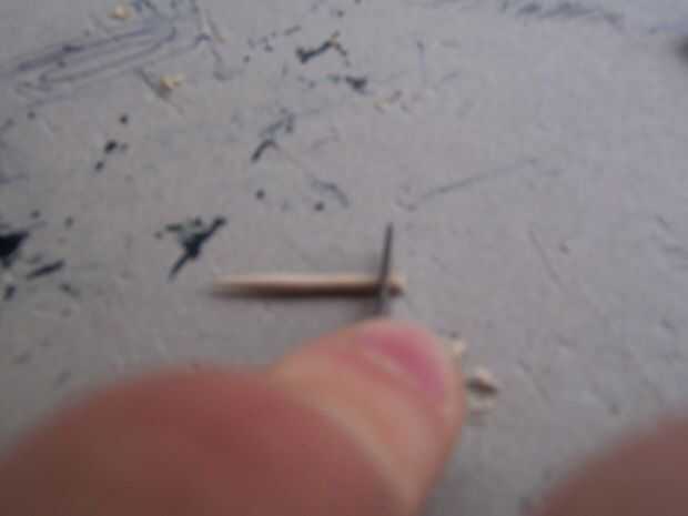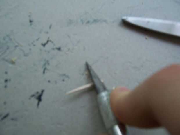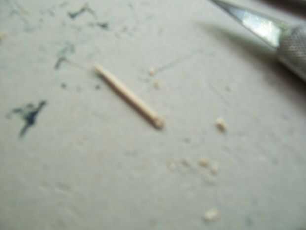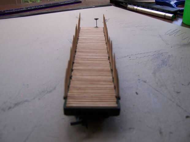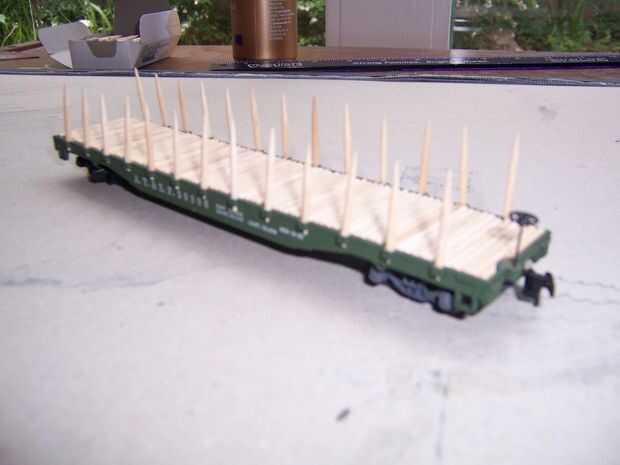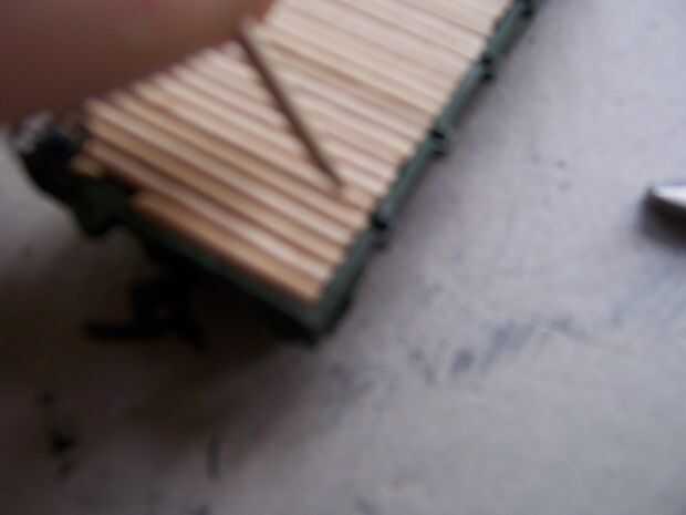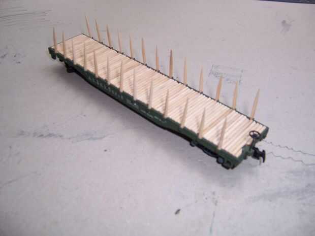 En primer lugar, conseguir esos pedazos de palillos de dientes que le dije no a tirar antes. (Yo usé 26) Tomar el cuchillo de la manía y corte una muesca a la mitad de la parte inferior en el extremo plano. Quite el poco de madera y luego afeitado de los lados de un ahusamiento cuadrado. Está sobre él; pegue el extremo cortado en el pentagrama las ranuras a lo largo de flatcar (necesita ajuste de prueba primero) y firmemente shove en sostener. Si desea utilizar el flatcar otra vez sin pentagramas, dejar como esta, permitiendo fricción sostenerlas en lugar. Si desea que los pentagramas más con seguridad y permanentemente colocados, puede Agregar un poco de pegamento al final antes de poner cada palillo en su ranura.
