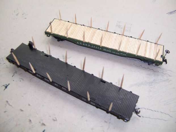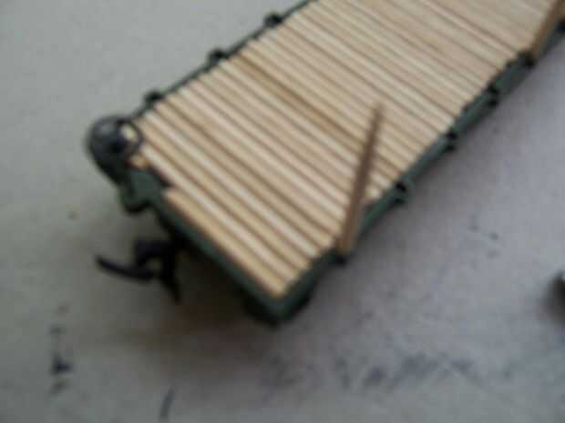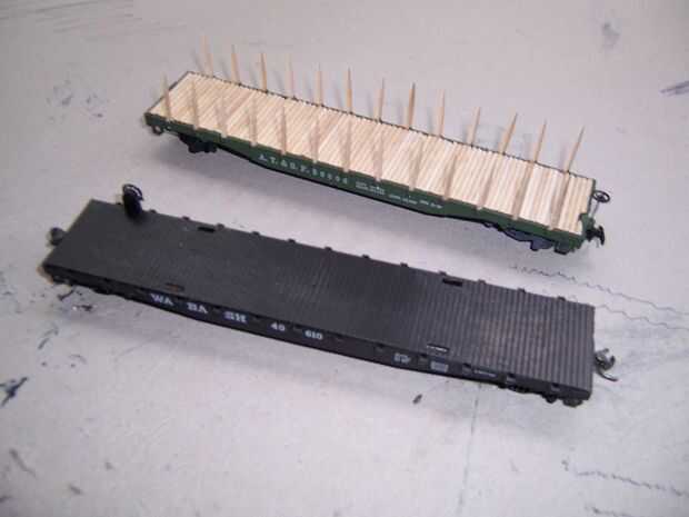 Además de ser desmontables, estas varas de palillo de dientes trabajan en otros vagones playos que no tenga una cubierta de palillo de dientes. Ya que permanentemente estoy perdiendo mis pentagramas flatcar, esto hace de una manera fácil de sustituir.