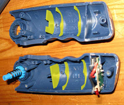 Como nuestro nuevo pack es modelo más grande el antiguo, tendremos quitar el antiguo soporte (señalado en amarillo), Yo lo hecho con una dremel pecado problemas.