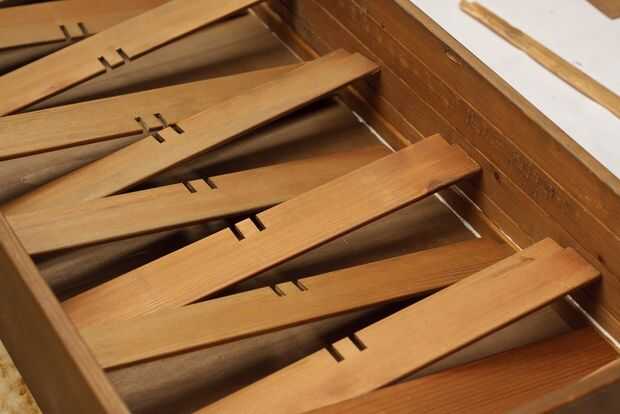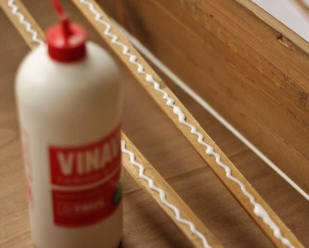 Añadir pegamento en los palos y luego presionar contra los lados de la forma que prefiera. Usé el mismo piezas de madera como en las fotos. Esperar algún tiempo hasta que la pega se seque.