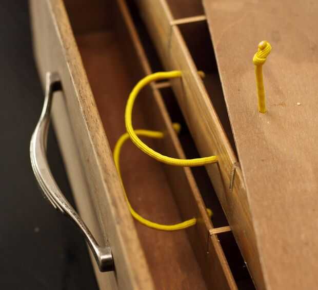 I taladrar los agujeros en los lados de recipientes, había hecho un nudo en un extremo, inserta el otro extremo en los agujeros, hizo el segundo nudo, cortar y quemaron las extremidades de la cuerda con un mechero.