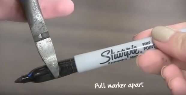Cuidadosamente separe su marcador Sharpie. Si tienes un marcador mayor, puede que necesite dos alicates en vez de uno. Se escuchará un fuerte "clic" cuando el marcador se desprende. Esto es normal.