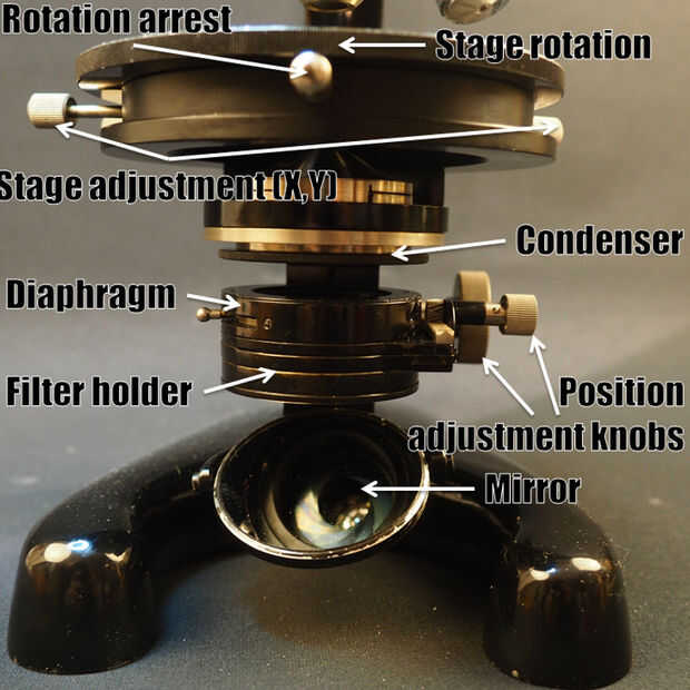 El microscopio tiene dos intercambiables diferentes condensadores; uno tradicional y un condensador de campo oscuro. La función del condensador es llenar el objetivo uniformemente con un cono de luz. Este cono de luz es estrecho para un objetivo de apertura baja pero debe ser muy amplia para una alta apertura. El condensador le permiten ajustar el ancho del código mediante el ajuste de la distancia entre el condensador y la muestra. Partes del objetivo que no recibe luz no pueden participar plenamente en la formación de la imagen!