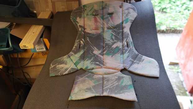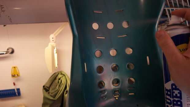 Una colchoneta fue cortado a la medida, utilizando la cubierta de asiento como un molde. Spray pegado en el interior de la silla y aplica la colchoneta cortada a la medida.