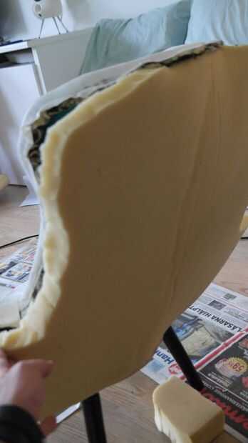 Me llevó el colchón y levantó a la parte trasera de la silla. Entonces había marcado el contorno de la silla con un rotulador y cortar con un par de tijeras. Obviamente, algunos ajustes que hacer para que se ajuste realmente agradable. Recortado un poco más fino alrededor de los brazos, para dar lugar a los bloques de refuerzo.