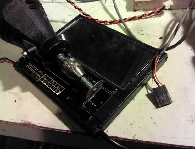 Como se ve en la foto, tuve la suerte de encontrar una pila de monedas en el primer intento. Utilizando la herramienta dremel con un dedo meñique o dos para el apoyo en la mesa, cortar un cuadrado poco profundo (a profundidad plástica estimado) aproximadamente tamaño de un sello. Mantenga la pieza de corte cuadrado de plástico para usarla más tarde. La batería debe estar expuesta. En este punto Asegúrese de identificar y registrar la ubicaciones de plomo de la batería y la polaridad.