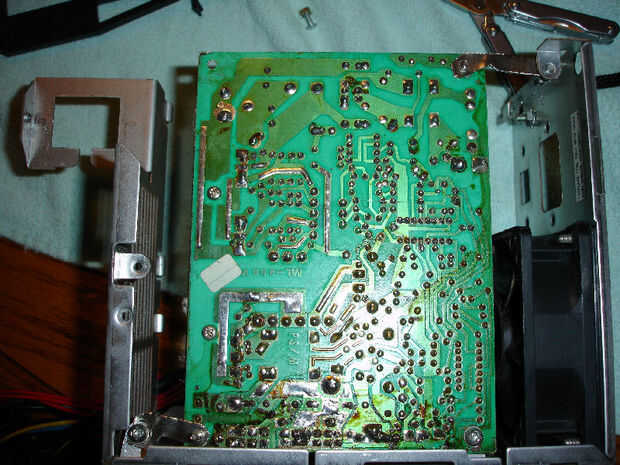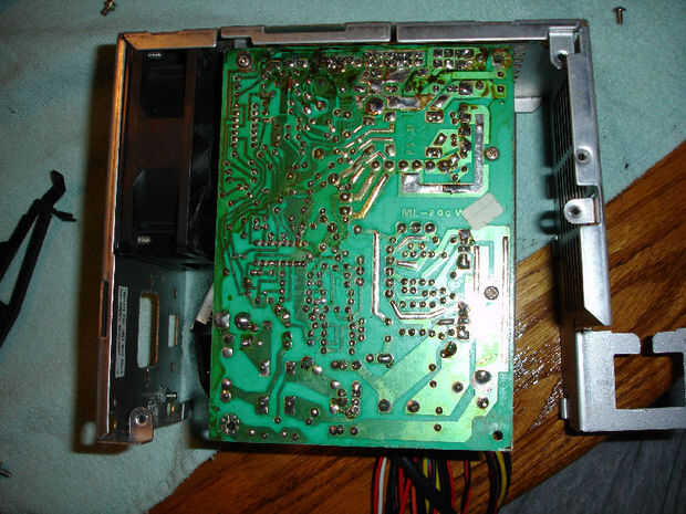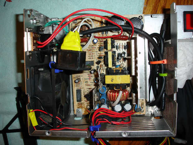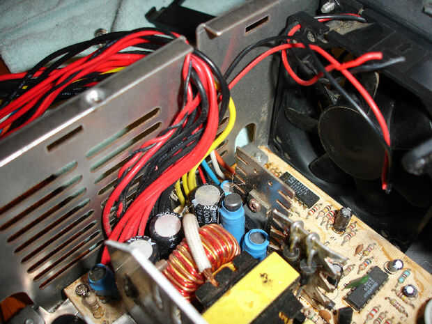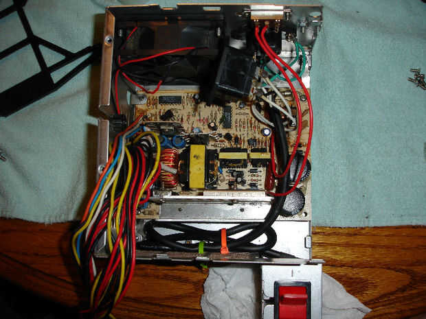 La última foto muestra la fuente listo para volver a armar. El viejo ventilador está conectado y la energía adicional enchufe de salida es comprimida en el lugar y los cables traseros son grabados.