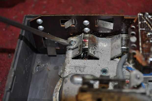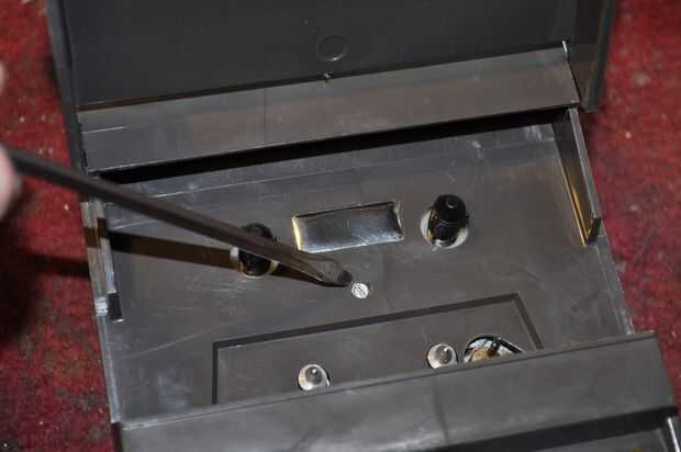 en el pozo de cassette (área donde se inserta el casete) habrá un tornillo en el centro, quitar. máquina tirón encima y usted encontrará uno o dos tornillos que sujetan la tapa inferior. las máquinas tempranas utilizan dos tornillos. quitar los tornillos hará parte inferior cubierta y batería puerta salir.