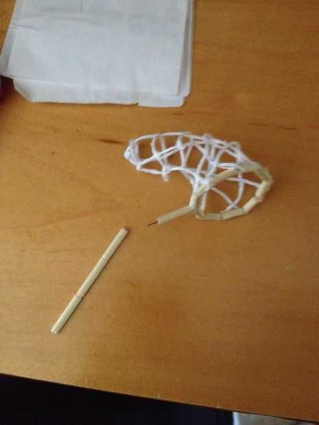 El blanco parte de la red fue hecho de hilo y tela pegamento. Usé una brocheta de madera para crear la parte de madera. La pieza redonda de la red fue creada con piezas pegadas juntas para formar un círculo. Se celebran en por pequeños pedazos de la grapa.