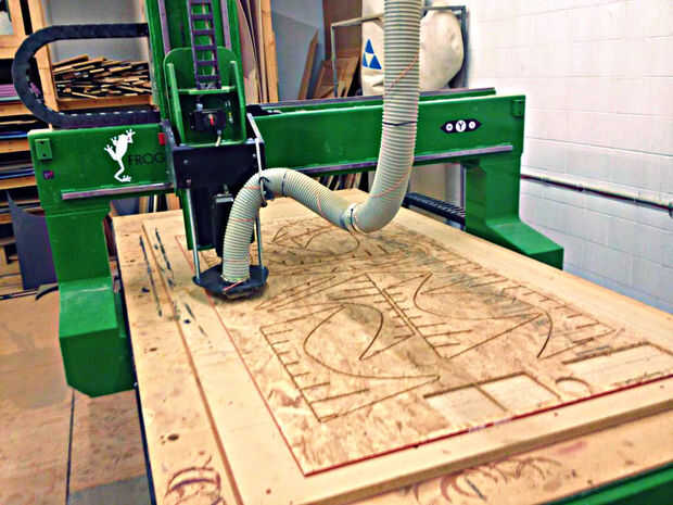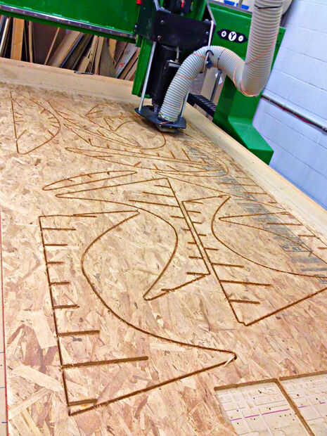 Con todo, hemos tenido 5 hojas de 4' x 8' tablero de viruta para máquina. Que poner cada pieza hacia abajo, carga el g-code y corte. para nuestra primera hoja utilizamos pequeñas lengüetas para mantener las partes corte conectado al material stock pero rápidamente se dio cuenta de que esto significaba un montón de acabado implicaría.