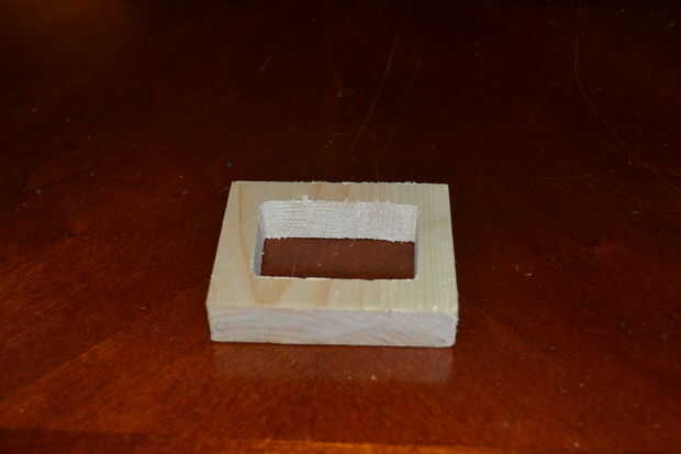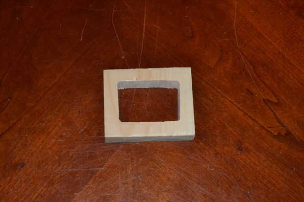 2. corte a 1 y 1/2 por 2 y 1/2 agujero rectangular en el centro, lo suficientemente grande como para albergar el cilindro. para ello, primero dibujé donde el agujero rectangular iría, perforó un agujero en medio de ella y entonces alimenta la hoja de mi sierra de marquetería a través del agujero y corte a la línea.