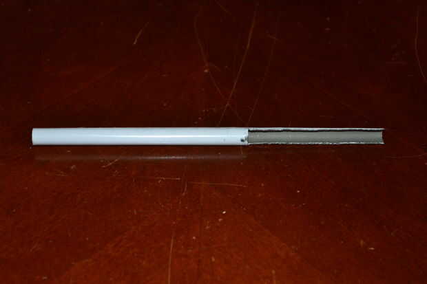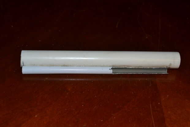 2. corte a 1/2 de la tubería a lo largo, comenzando en un extremo y va ~ 2 y 1/2 pulgadas