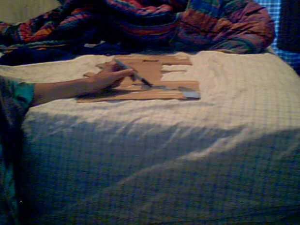 breves instrucciones... esto es sólo hecho de cinta adhesiva, cartón, pegamento caliente y el marcador lo primero que hice fue a sorteo las piezas en una hoja de cartón. luego con un xacto cuchillo que corté las piezas hacia fuera entonces yo calient