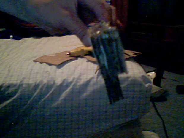 breves instrucciones... esto es sólo hecho de cinta adhesiva, cartón, pegamento caliente y el marcador lo primero que hice fue a sorteo las piezas en una hoja de cartón. luego con un xacto cuchillo que corté las piezas hacia fuera entonces yo calient