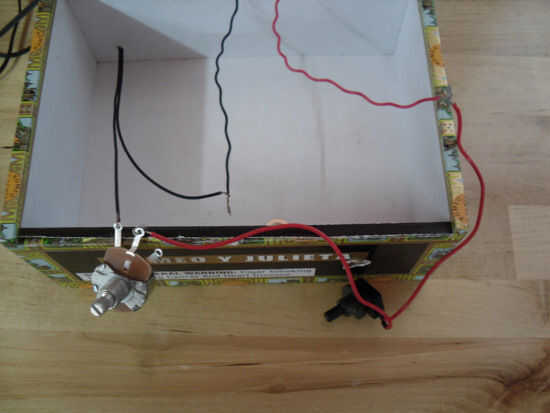 Pase los cables desde el cargador a través del orificio en la parte posterior de la caja de cigarro. Conecte el positivo al reóstato en la pestaña izquierda (si usted está mirando directamente la perilla a la izquierda). Conecte un cable desde el interruptor de encendido a la ficha de centro de reóstatos, luego conecte el otro cable al cable positivo del ventilador. Finalmente Conecte el cable negativo de fans para el cable negativo de cargadores, completando el circuito.