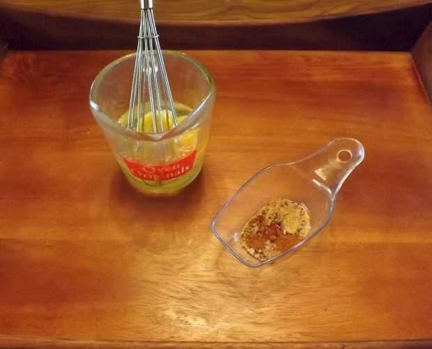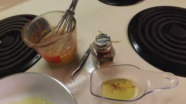 - Romper los huevos en un recipiente de vidrio o recipiente; Añadir 1 cda agua a temperatura ambiente y batir vigorosamente hasta que terminó mezclado; luego agregar la mezcla de especias (excepto el azafrán) y batir otra vez.