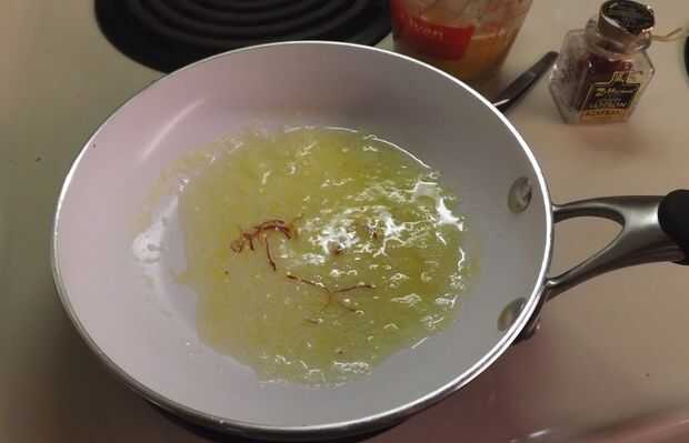 - Cuando la mantequilla se haya derretido, añadir el azafrán en remojo a la olla y dejarlo cocer a fuego lento en la mantequilla (revolviendo muy suavemente con una espátula de goma) durante unos segundos para que el color y el sabor del azafrán se distribuye uniformemente.