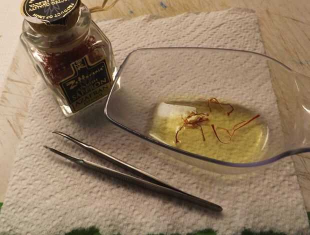 - Colocar unos hilos de azafrán Español (recuerda: una muy pocas) en un recipiente no metálico y añadir aproximadamente 2 cucharadas de agua muy caliente. Permitir que las hebras de azafrán empapar en el agua caliente mientras usted continúa.