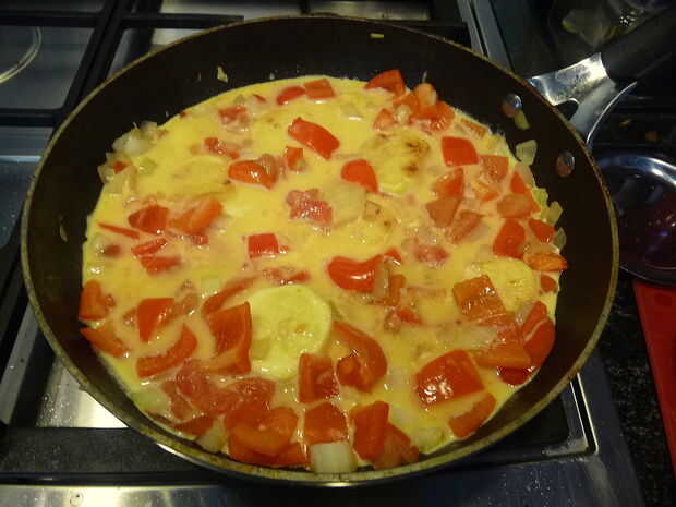 Ahora añadir la mezcla de huevos y la leche a las verduras.