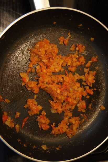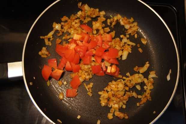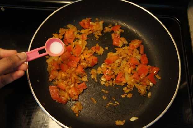 3) luego agregar el tomate picado, sal y cocine hasta que los tomates estén blandos.