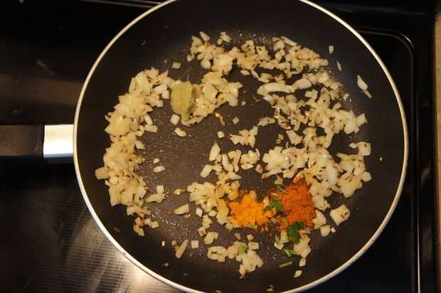 2) Coloque una cacerola a fuego medio, agregar el aceite, cebollas picadas, pasta de ajo jengibre, cúrcuma, polvo de chiles y rehogar por unos minutos.