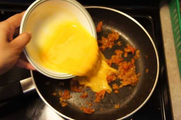 4) ahora agregar el huevo y seguir mezclando hasta que los huevos estén cocidos.