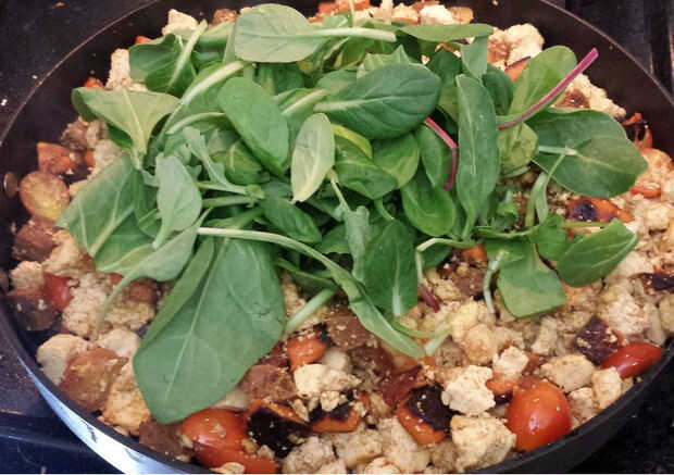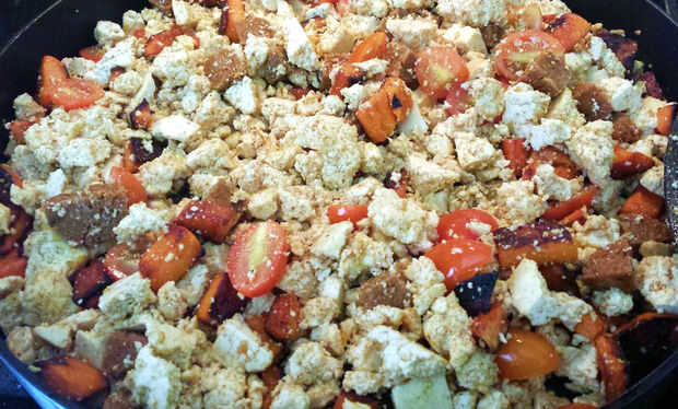 * Mezcle el Tofu sazonado y tomatitos en rodajas (también lanzó en algunos salchicha de chipotle picado vegano para hacerlo un poco más robusta y más picante!)