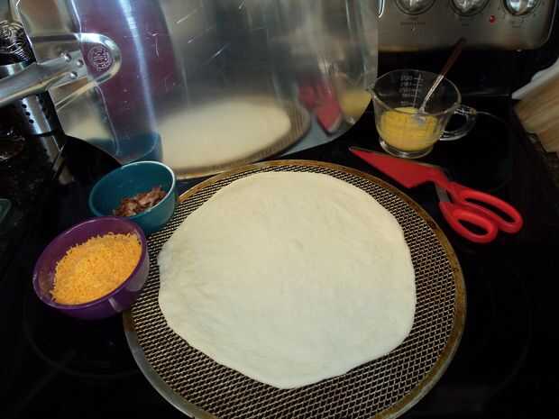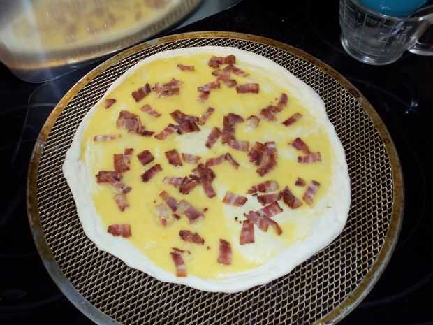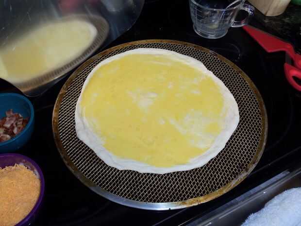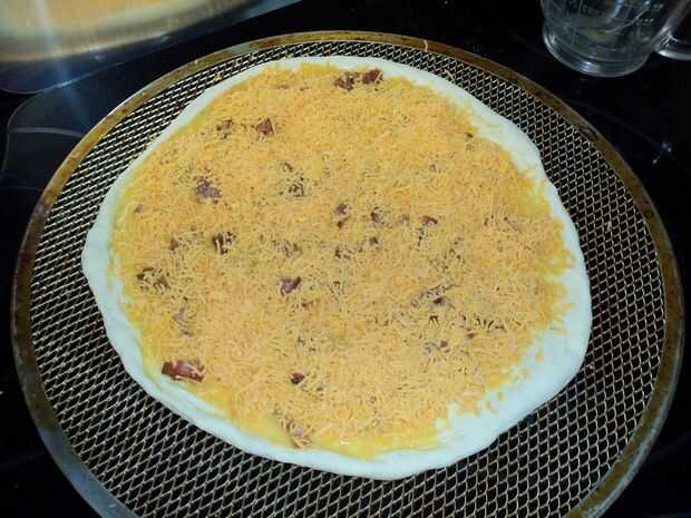 opciones de pizza de desayuno son ilimitadas. He hecho 2 de las combinaciones disponibles:queso crema, huevos, queso cheddar y tocinosalsa, huevos, queso cheddar, cebolla y salchichaPero podrias ponerlo que quieras en él. Nada puede poner en un sándw