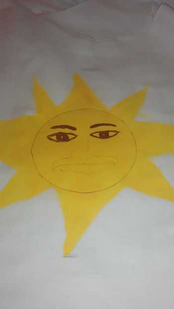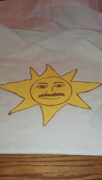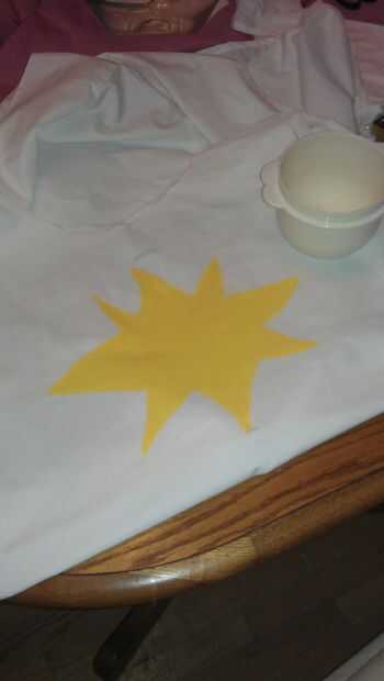 Por último, el logo necesario ser pintado en. Antes de hacer esto, es importante que cualquier arrugas en la hoja de la izquierda fueron eliminadas. Para lograr esto, la túnica era cocido al vapor, pero se puede utilizar una plancha si estuviera cuidado de no derretirse el pegamento donde se unieron los dos lados de la hoja. Una vez que la túnica era cocido al vapor, mi esposa, otra vez, colocar en la túnica, y se utilizó un lápiz para marcar donde deben caer el superior, inferior y lados del logo. La túnica fue luego presentada en la mesa, periódico fue colocado dentro para evitar el sangrado a través de, y comencé a esbozar el logo de sol dentro de los límites definidos por las marcas del lápiz. El cuadro de referencia que utiliza para esto era del protector de una figura de acción de King Arthur, encontrado por googlear "King Arthur Monty Python". El contorno fue bosquejado primero y rellena luego con amarillo. Luego un 4-4.5 pulgadas redondo objeto de fondo se utilizó para dibujar el contorno de la cara del sol. y la cara fue dibujada en el. No se olvide el bigote de la firma. Todo esto fue bosquejado en la pintura amarilla con lápiz y luego pintadas con una mezcla de pintura marrón y amarilla. (Fue muy ligero marrón) Los bordes fueron, también, destacó en la mezcla de amarillo-marrón.
