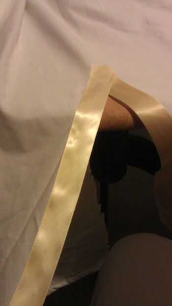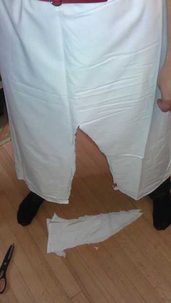 A continuación, una sección triangular necesita recortarse la parte delantera del traje para que coincida con el original de la película. Mi esposa dejó el traje en y el frente fue cortar aproximadamente desde el interior de la pierna en la parte inferior a un punto en el centro del frente, haciendo coincidir aproximadamente con la parte superior de la entrepierna de sus pantalones. Entonces, la izquierda los bordes de esta sección que corte, así como la parte inferior de la parte delantera de la túnica fueron recortada en cinta dorada. (Si tuviera que hacerlo otra vez, compraría suficiente cinta para recortar también la parte inferior de la espalda del traje) La cinta fue unida con pegamento caliente.