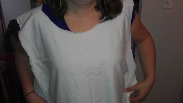 Una vez que la hoja estuviera pegada, la hoja fue doblada por la mitad ancho. El centro del pliegue se encontró y se cortó un agujero cabeza áspero. La túnica fue luego juzgada, y el "agujero de la cabeza" fue ajustado para confort y para que se sentó uniformemente frente y la espalda. Mientras que mi esposa lo estaba probando, se observó que la túnica era todavía un poco amplia, por lo que decidimos que los hombros debían cortarse un poco. La parte delantera de la túnica era seguridad cubrió sobre la espalda a ambos lados, mientras que llevaba, y las marcas fueron hechas donde reunieron las hojas y que el borde de sus hombros. Ella entonces quitó la túnica, dejándolo clavado y los hombros se recorte de las marcas que se acaba de hacer. La túnica fue juzgada nuevamente, y el ajuste era buena.