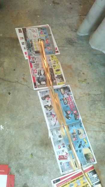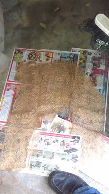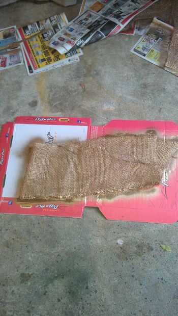 Por último viene la cota de malla para la cabeza. Esto fue hecha en dos piezas, con arpillera. Una forma aproximada de "U" se cortó la punta del hombro. La "campana" fue creada tomando un trozo de arpillera aproximadamente 36 "x 7", doblar por la mitad a lo ancho y pegado por un lado. También fue utilizado un chorro fino de pegamento alrededor de los bordes arrastrados de arpillera así (lo que no se pegue a otra cosa) para evitar el desmoronamiento del material. La punta del hombro y la "campana" fueron pintados con aerosol oro.