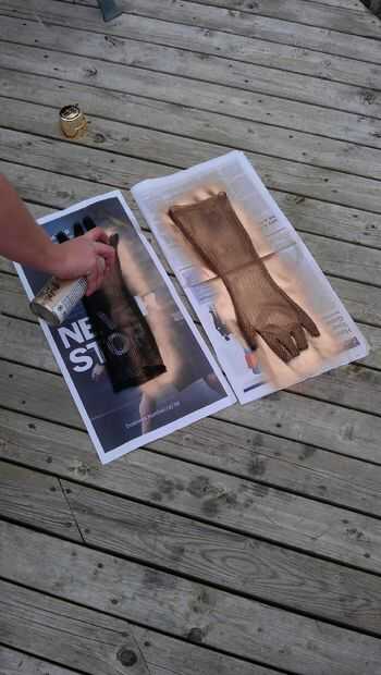 Los guantes de malla / mangas fueron pintadas oro - hecho (aunque si iba a hacerlo de nuevo, utilizo corte leotardos de malla en su lugar, para que todo el brazo está cubierto por el efecto de cota de malla completa.