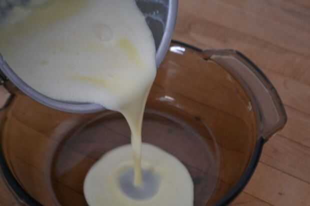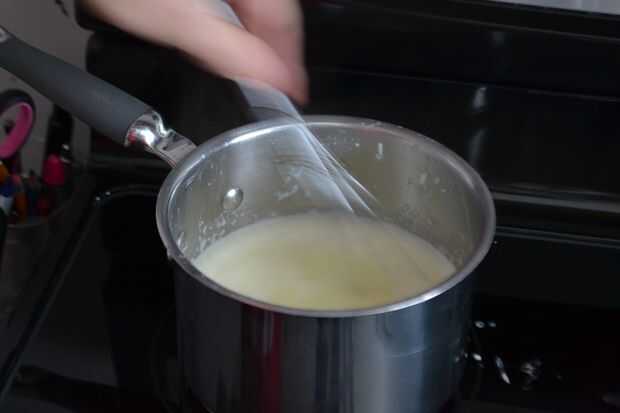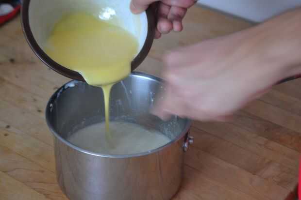 Paso 6. Mientras batir la crema en la olla, Vierta lentamente los huevos templados en la crema.
