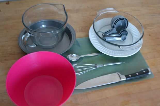 Equipo necesario se muestra en la segunda foto. Necesita 3 tazones de fuente medio, y al menos uno de ellos debe ser de microondas seguro. Utilicé un molde para pasteles antiadherente para mis brownies, pero puede utilizar un 8 o 9 pulgadas cuadrados pan si quieres; Si utilizas un molde de 8 pulgadas los brownies será muy gruesos. Te recomiendo un fino colador para tamizar la harina y el cacao pero ya que no es absolutamente necesario, no está en la foto. Usted también necesitará un baño María o a microondas.