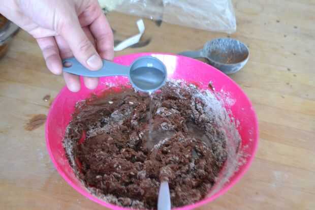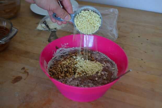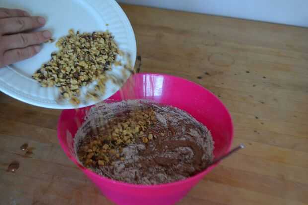 Paso 10. Agregar este nuevo mix de chocolate a la harina y revolver. Una vez que está casi completamente mezclado, añadir las nueces, chispas de chocolate y agua. La mezcla debe ser pegajosa.