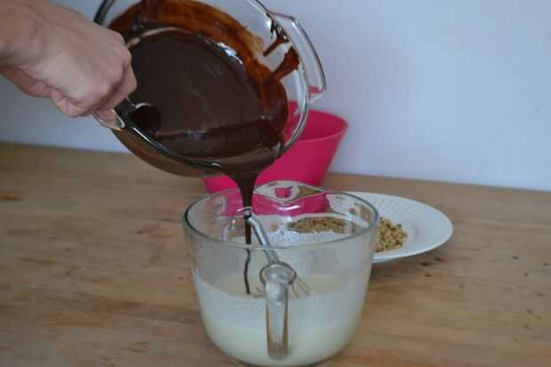 Paso 9. Una vez que ya no se siente caliente cuando meter un dedo en se ha enfriado el chocolate derretido, agregar a la mezcla de huevo y revolver. Agregue 1/4 taza de agua.