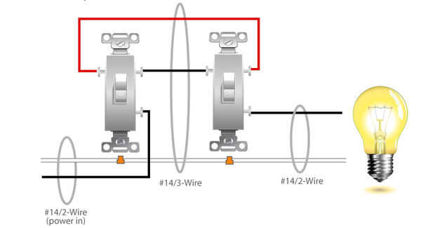 Cuando el cableado de los interruptores, asegúrese de que obtener interruptores de "3 vías" - y también mediante cable "14/3". Esto permitirá que cualquier interruptor para controlar la luz sin importar la posición el otro interruptor es en! Usted puede google cómo cablear estos correctamente. Proporcionó el diagrama que usé para esto.