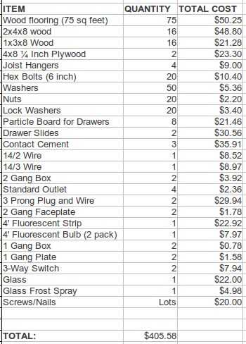 Añadí unos $20 tornillos/clavos porque comprar en bulto y tenía un suministro de ellos ya en mano.