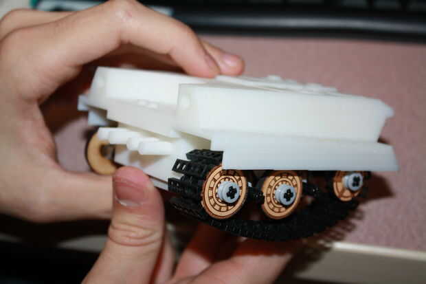Mientras que la mitad delantera del casco todavía fue impresión, tomó la parte posteriora completa mitad y agregué algunas ruedas y de la pisada para ver cómo todo se, y que calcen bien. Compré algunas uñas rellenos para pulir las partes ásperas del tanque que imprime irregularmente y lisa hacia fuera. La torreta era mucho más fácil trabajar con que el casco debido a la poca o ninguna complicación.