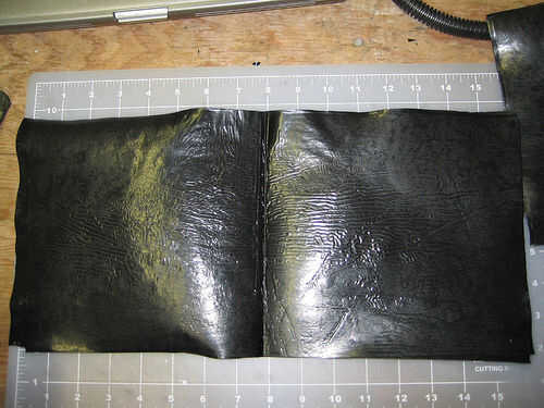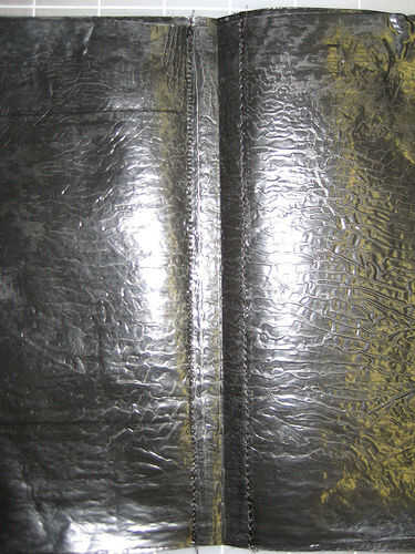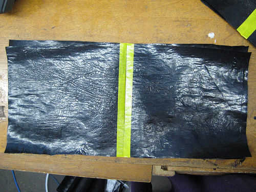 c. usando el pliegue como una guía, aplicar una longitud de 1/2"(1.3) enmascarando o pintores cinta ancha tan recta como sea posible a cada lado del pliegue. Enrollar los extremos de la cinta hacia el otro lado hacia el pliegue del centro para que las dos láminas de plástico están aseguradas y alineadas juntos. Estos serán tus guías para los dos primeros puntos de sutura. * La imagen muestra la cinta aislante amarillo. Cinta eléctrica es demasiado pegajosa en la parte inferior del pie de costura y hace muy difícil alimentar a través de la máquina. Utilizar cinta de papel!