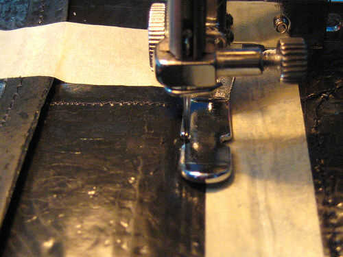 c. usando el pie de cierre, coser una 'U' alrededor y como cerca de la chapa como sea posible. Usando el pie de cierre adecuadamente asegurará tiene una costura estrecha y que no alimentan el metal arriba y debajo de la aguja. Siempre que tenga que dejar de coser y gire la pieza en la máquina, levantar el pie prensatela y hacerlo cuando la aguja está abajo en el material. Espalda-tack un par de veces al principio y al final de las costuras.