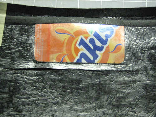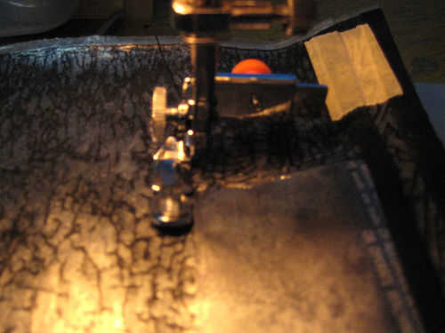 c. tomar otro pedazo y alinear justo debajo de la capa de bolsillo simplemente cosidas en, la misma distancia y paralelo desde el borde superior de la capa por debajo de ella. Ahora puede utilizar los bordes de las latas para alineación horizontal. En su lugar con cinta. Punto justo debajo del borde inferior de la lata, la anchura de la can, a través de todas las capas del plástico. Recorte el exceso por debajo de la costura. Repetir una vez más para el bolsillo de terceros.