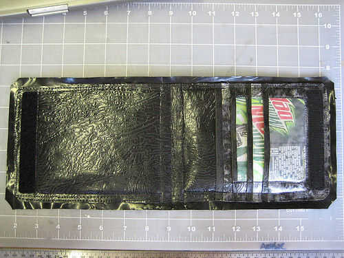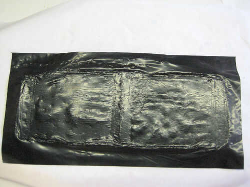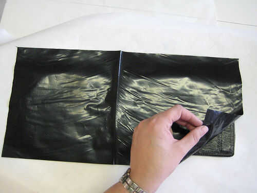 a. Coloque el lado de bolsillo bolsa abierta hacia abajo en la tabla de planchar y colocar #1 8 x 16 (20.5x41) la tira de plástico negro en la parte superior, permitiendo una buena pulgadas extra por todos lados. Fusible con el hierro. Toma mucho menos tiempo para fundir una hoja hacia el exterior. Usted puede siempre volver a aplicar el hierro si no derrite lo suficiente. Puedes trabajar algunas de las áreas con el hierro si no fusible de manera uniforme.